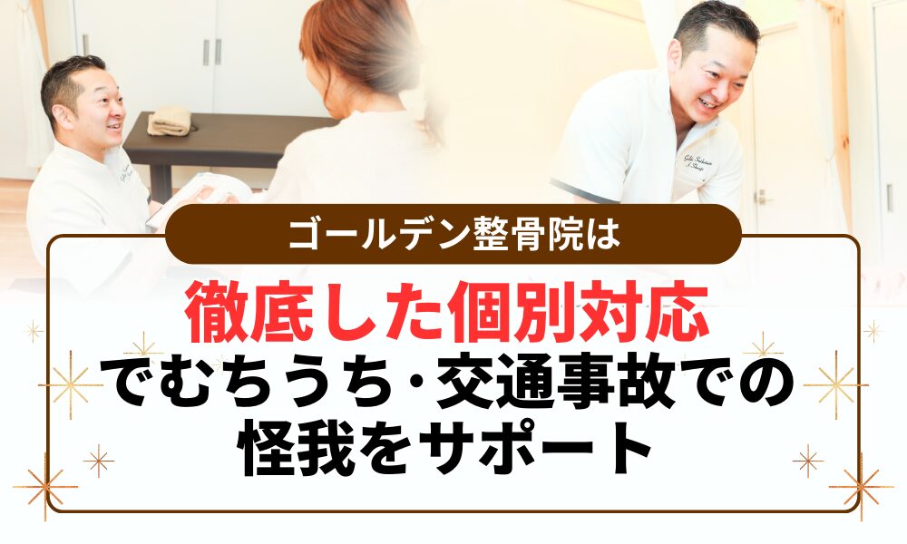 ゴールデン整骨院では、交通事故にあった患者さんへの個別対応を徹底しているため丁寧なフォローをすることができます。